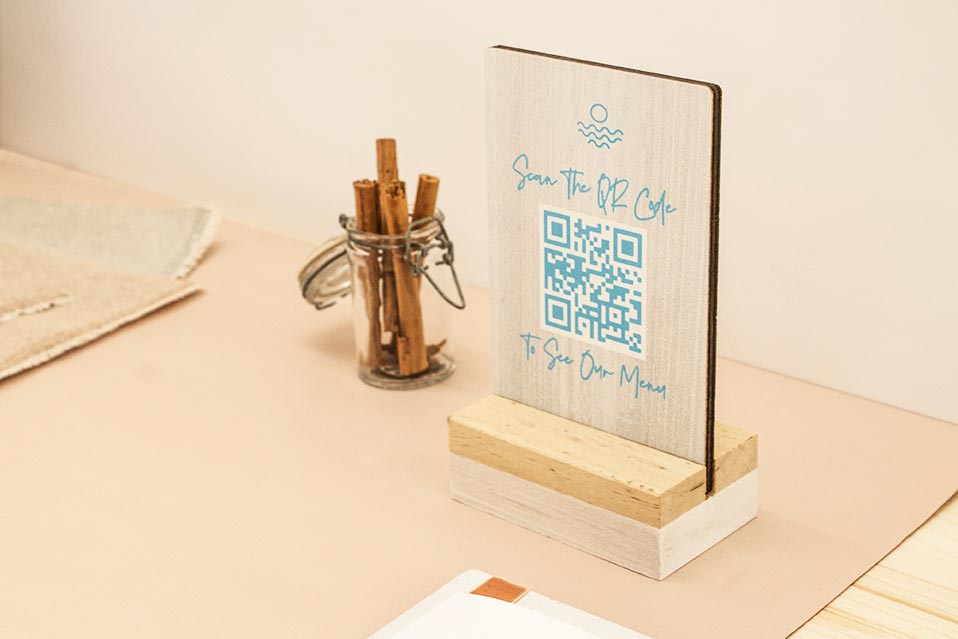 Base de madera maciza + placa madera impresa con QR 2 caras