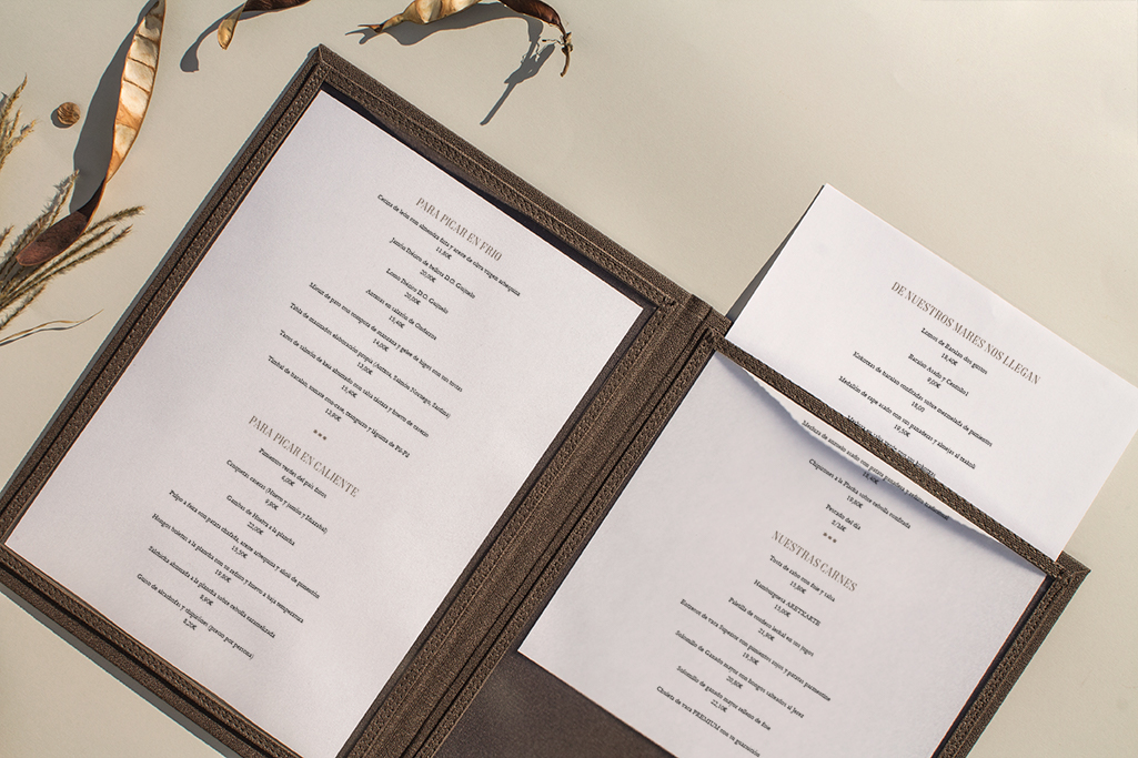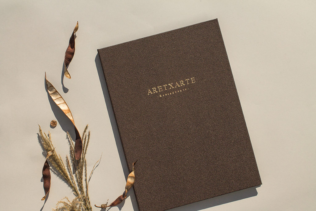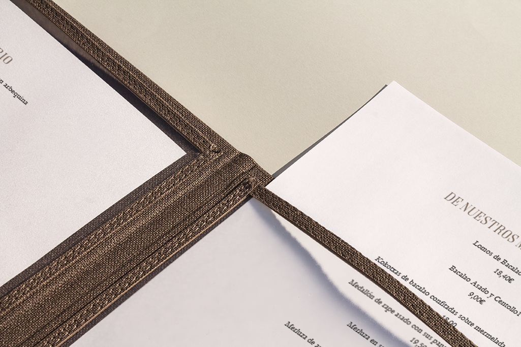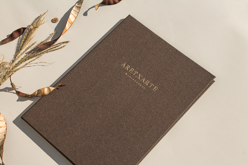 Carta díptica. Forro y guardas material de encuadernación símil tela. Fundas plástico. Logotipo stamping oro.