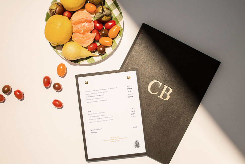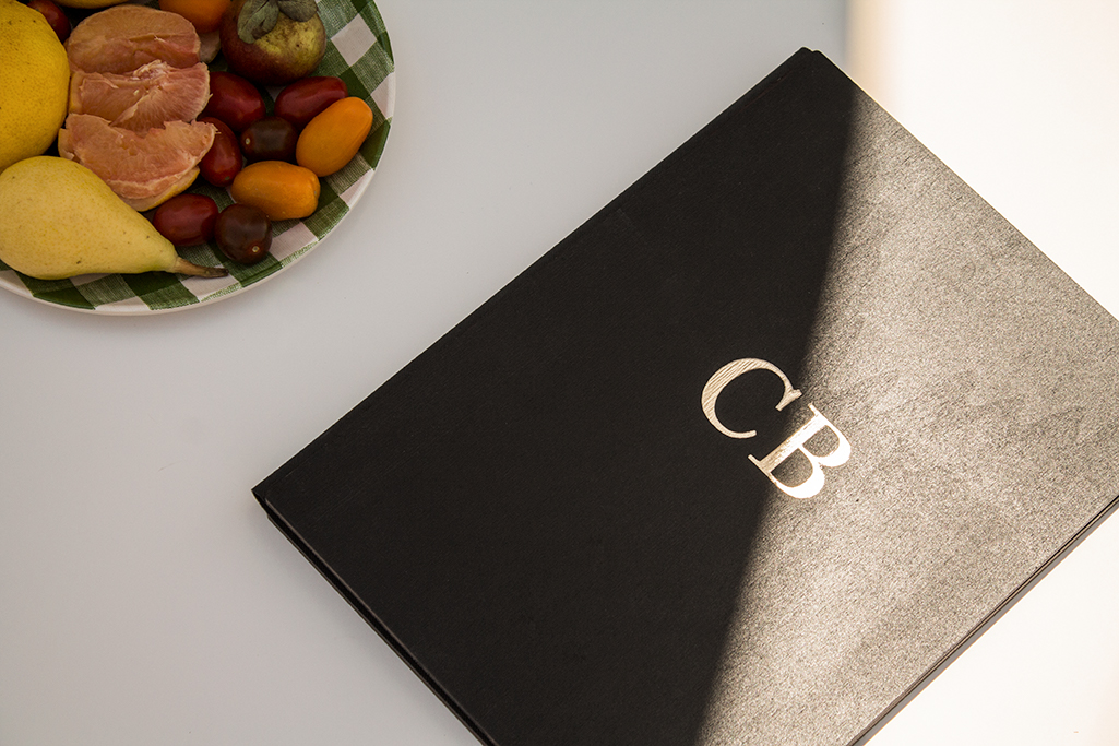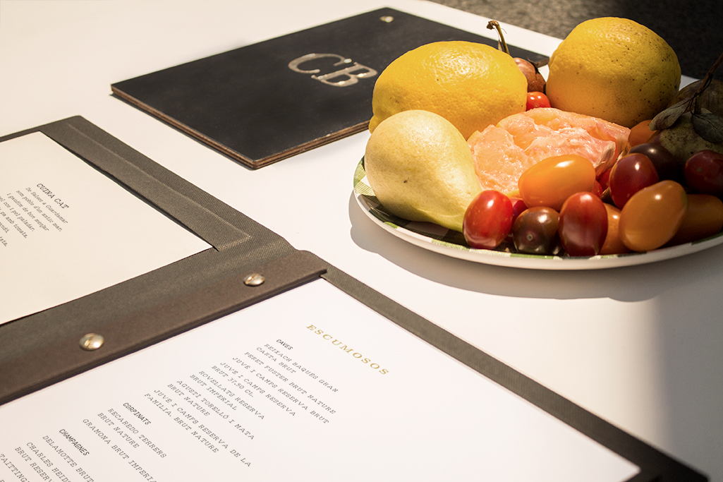 Carta vinos, díptica de madera con guardas en material de encuadernación símil textil color negro. Sistema sujeción mediante tornillos escondidos.