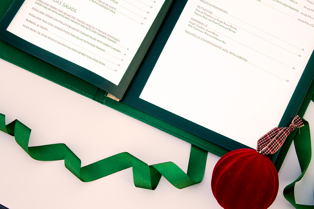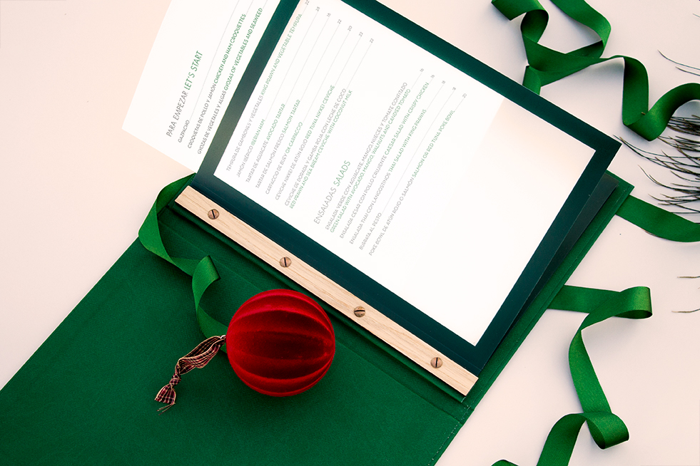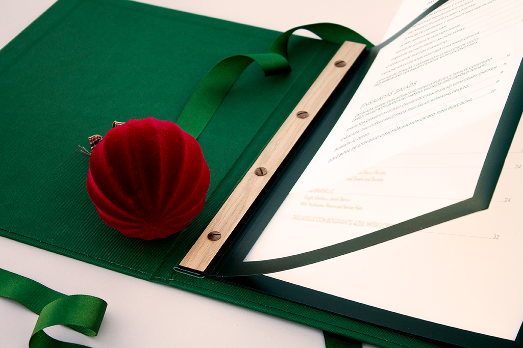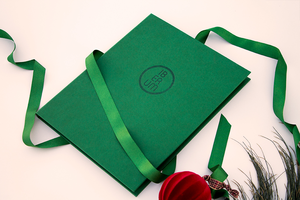 Carta díptica para hojas DIN-A4. Forro y guardas en material de encuadernación verde bosques. Sistema sujeción de contenido mediante fundas de plástico con marco decorativo. Logotipo stmaping seco.