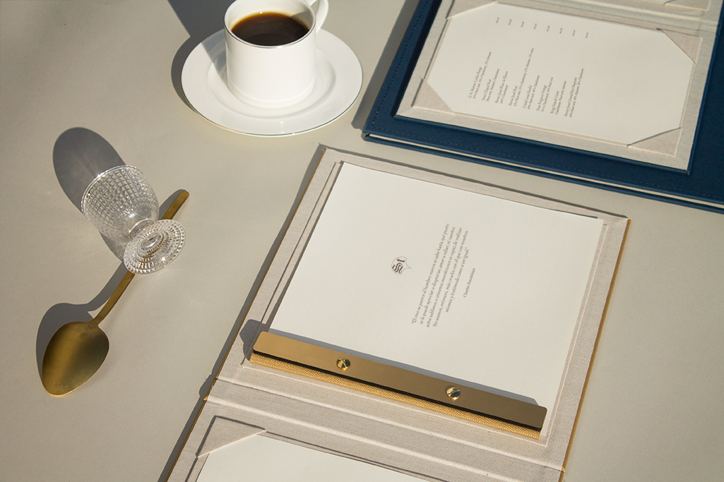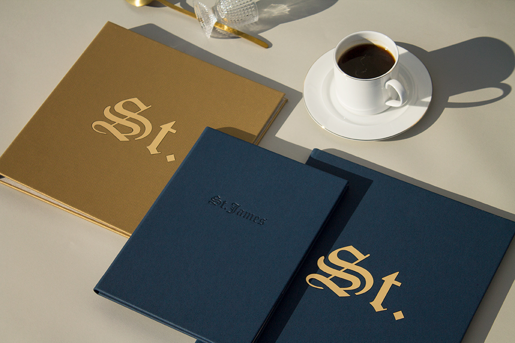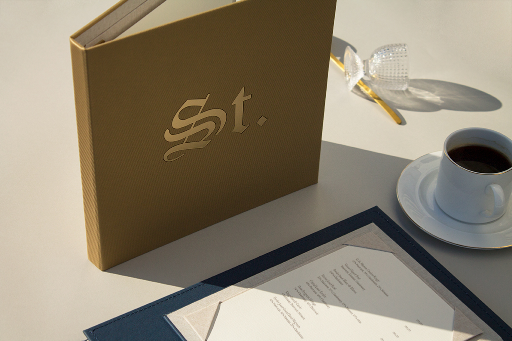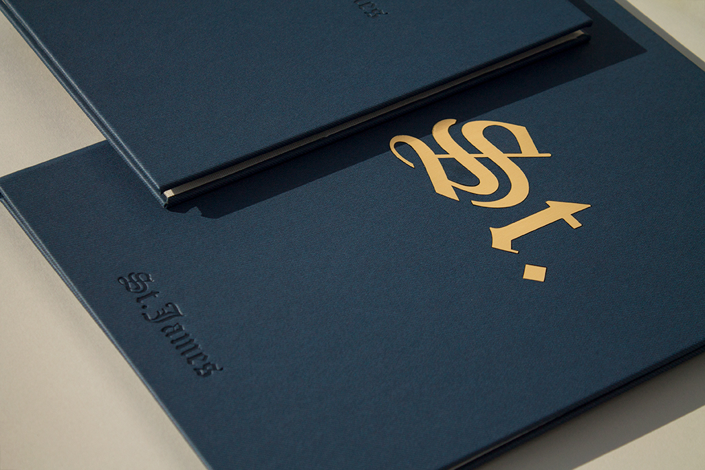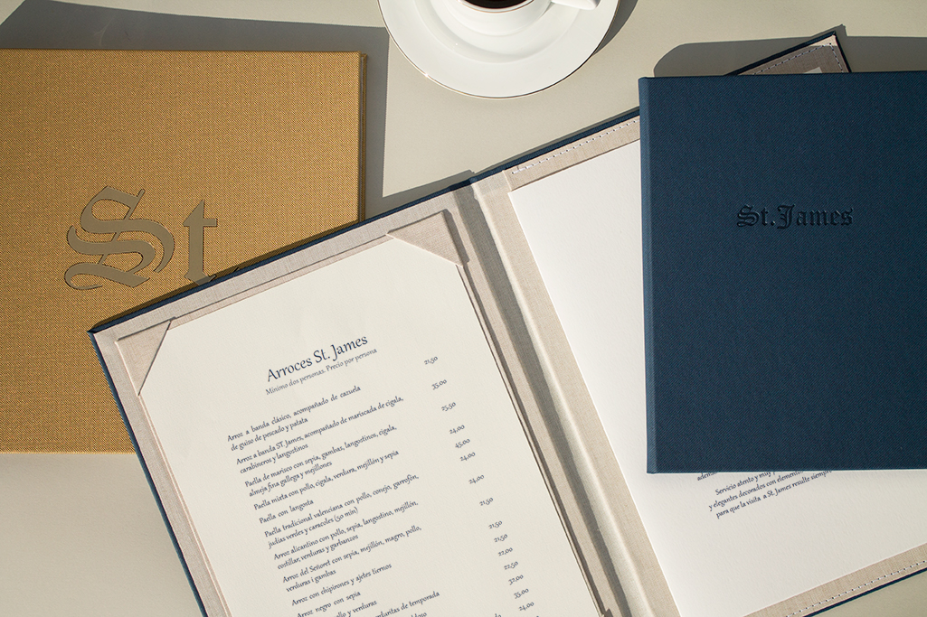 Logotipo troquelado y letras doradas encastradas + stamping.