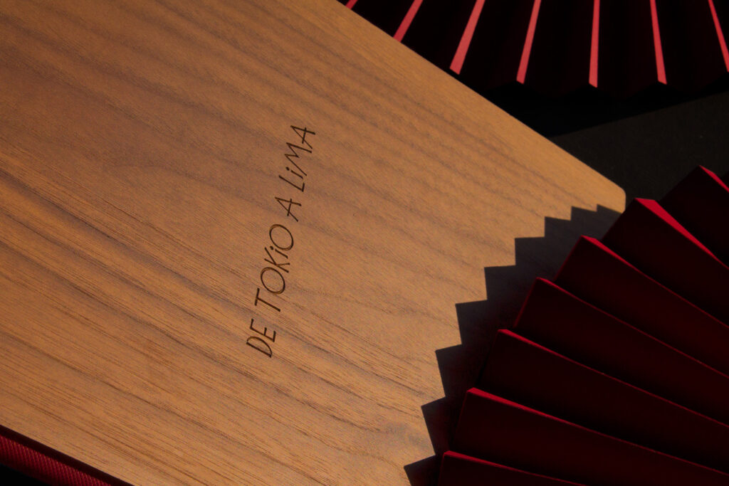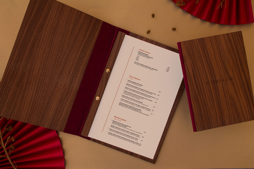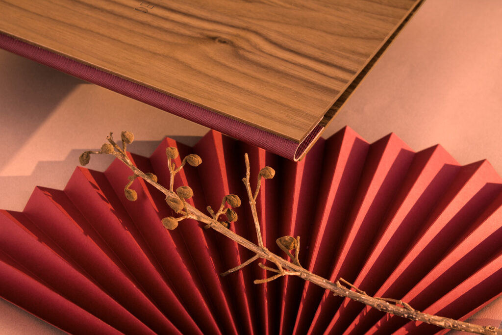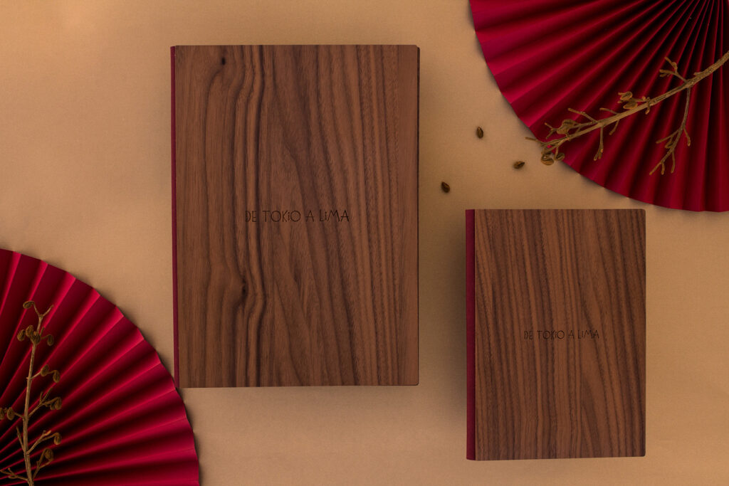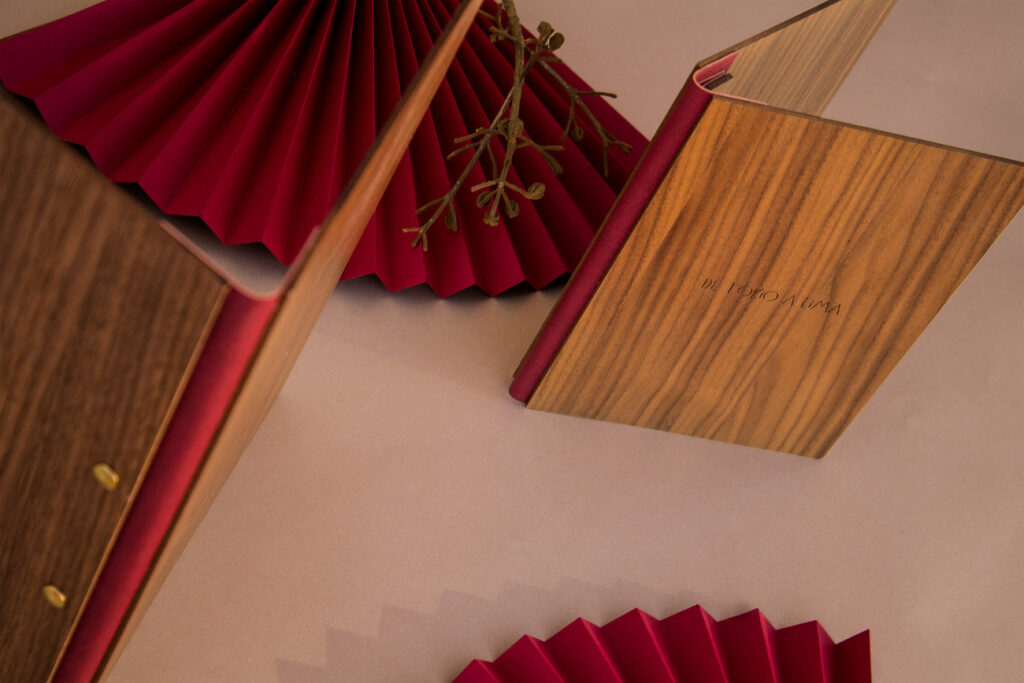 Carta díptica madera nogal. Material de encuadernación rojo. Sistema sujeción de contenido mediante listón y tornillos. Logotipo grabado en láser.