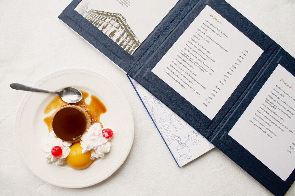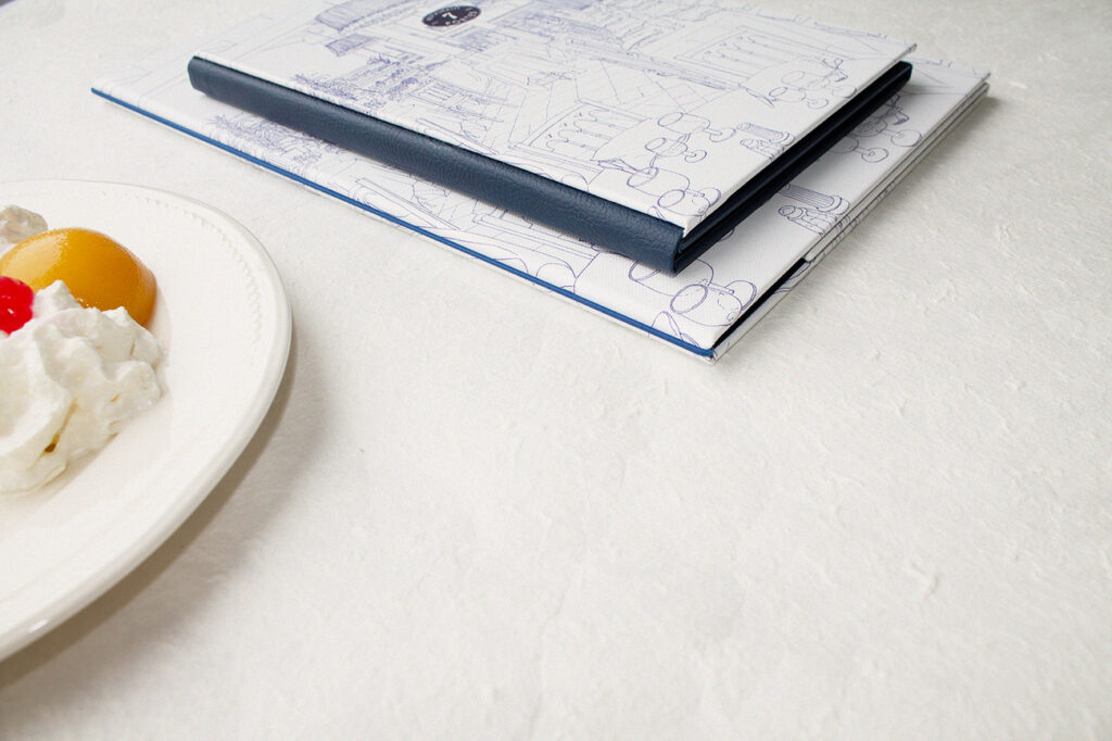 Exterior impreso con ilustración, interior material de encuadernación polipiel azul. Sistema de sujeción de contenido mediante cortes horizontales integrados arriba y abajo.