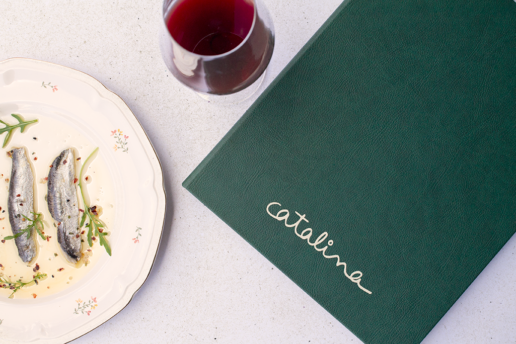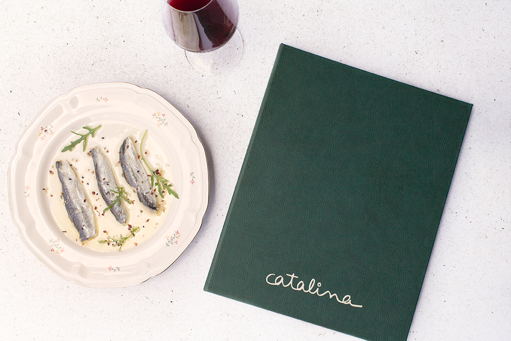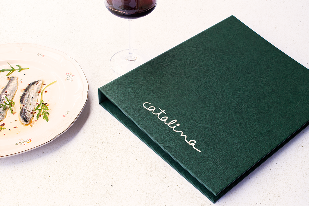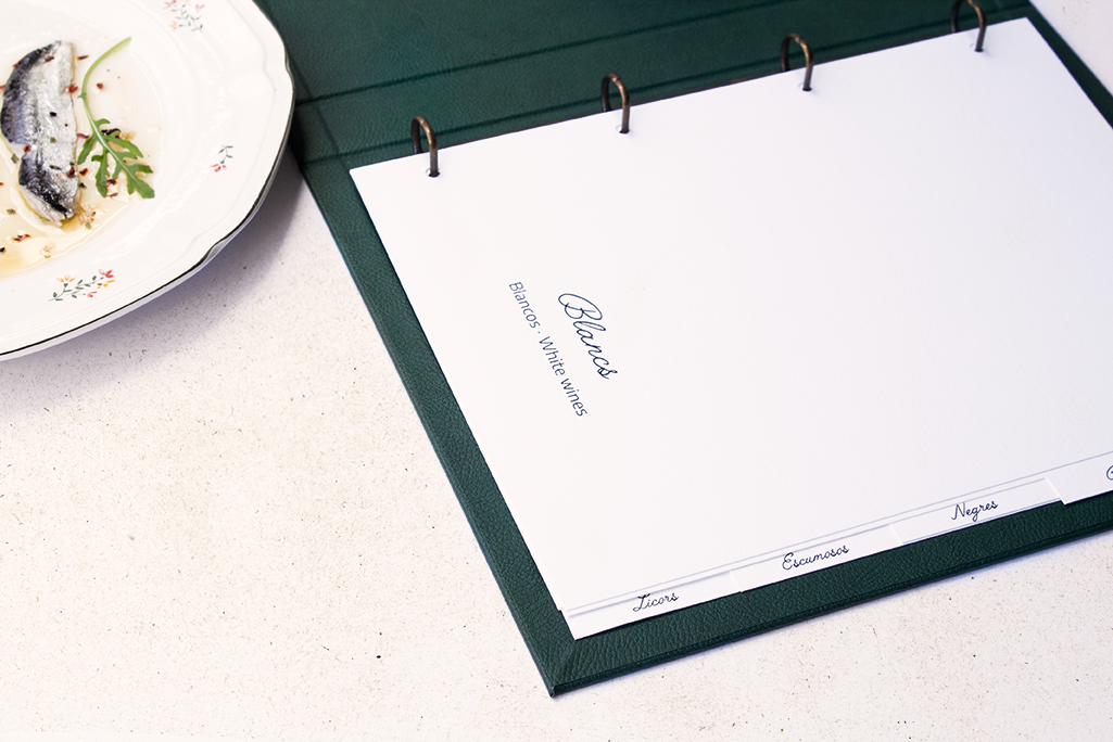 Carta díptica bodega. Cartón forrado con polipiel color verde. Sistema sujeción anills oro viejo y logotipo stamping beige