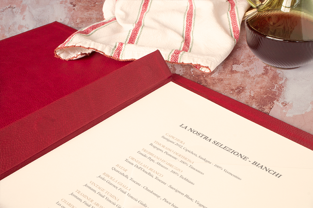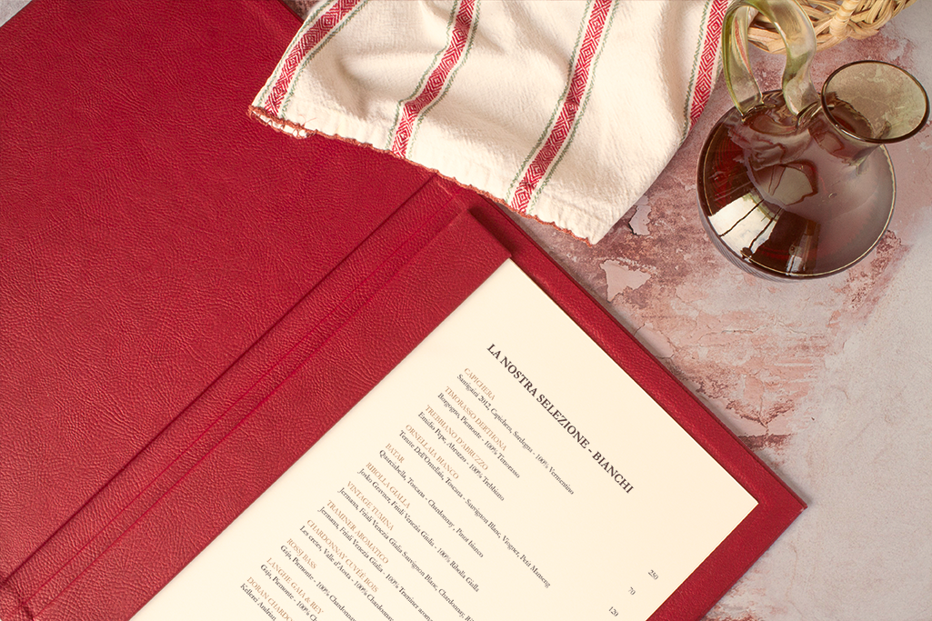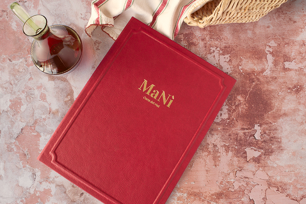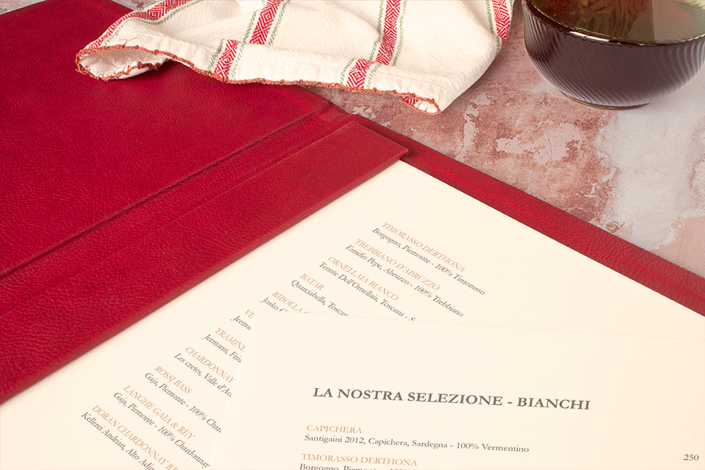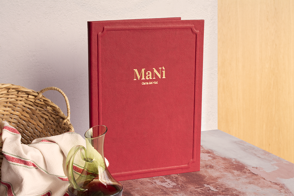 Carta díptica. Forro y guardas material de encuadernación símil cuero color rojo. Sistema de sujeción de contenido mediante listón imantado. Portada en relieve y logotipo stamping dorado.