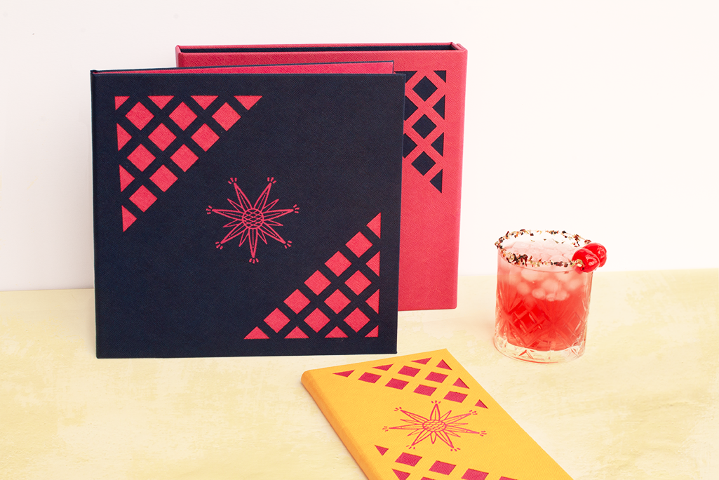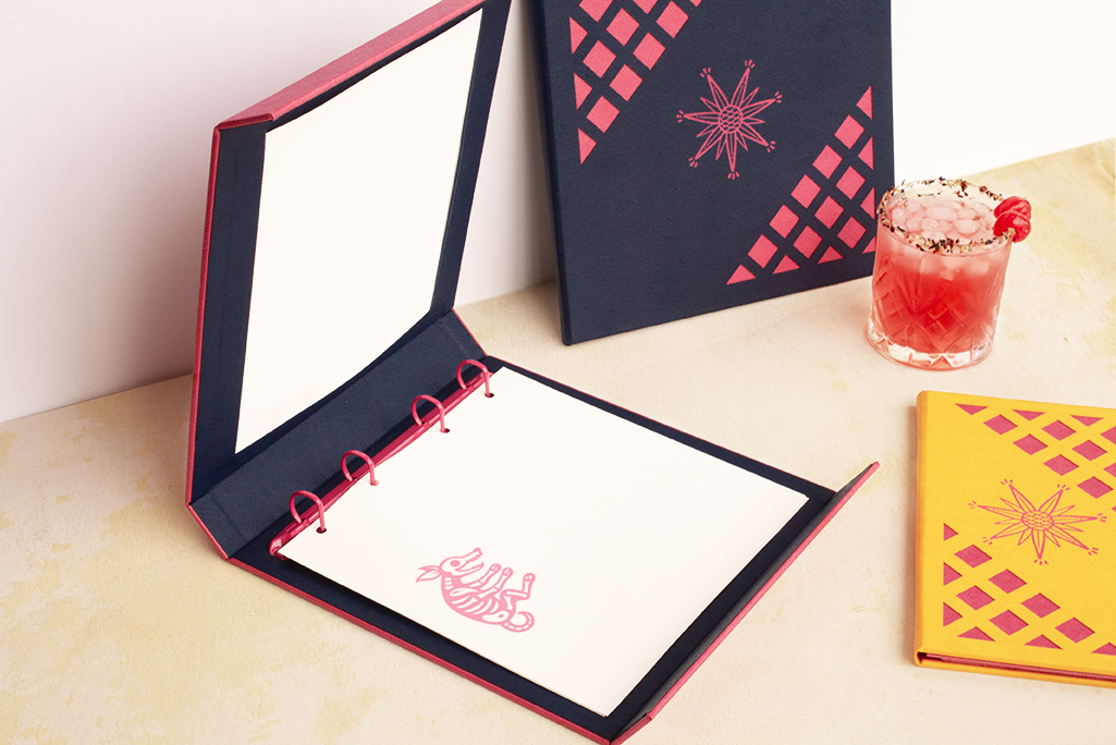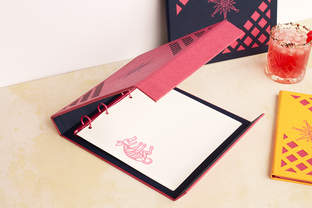 Carta mezcales, estilo caja con sitema sujeción de contenido de anillas rosa.